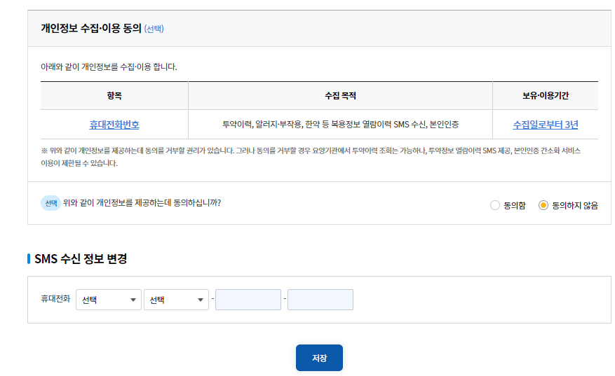 개인정보 수집동의를 선택합니다. 본인인증을 거쳐 개인정보 수집동의에 대해서 동의하거나 동의하지 않음을 선택하고 저장을 클릭합니다.