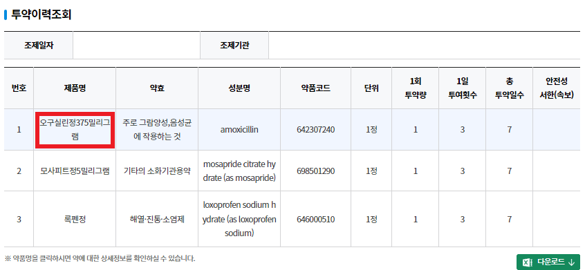 처방받은 약의 이름을 클릭하면 약의 자세한 설명을 확인할수있습니다.