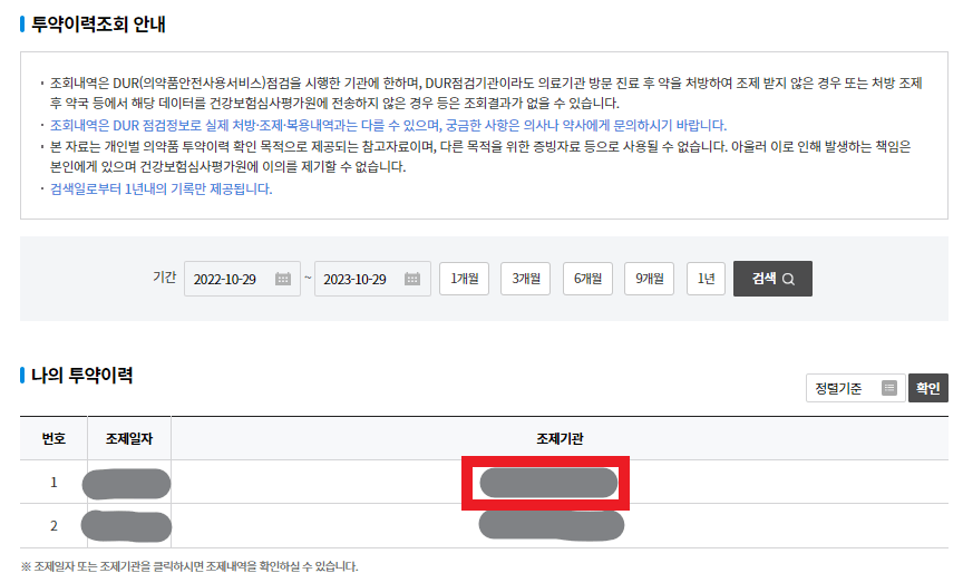 검색을 누르면 조제기관 목록이 검색됩니다. 조제기관을 클릭하면 조제기관에서 처방한 약들을 확인할수 있습니다.